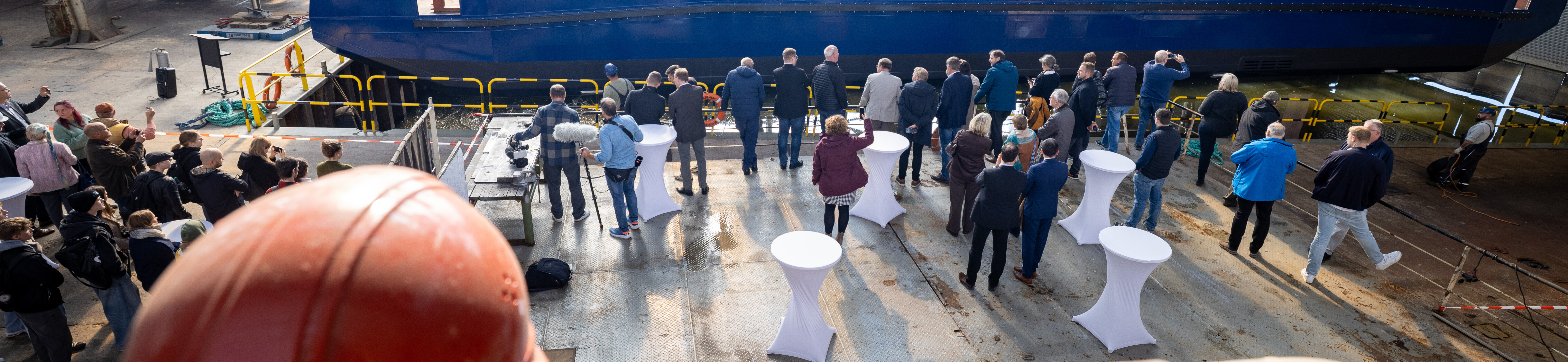 Lauenburg, 02. Oktober 2025: Ein wichtiger Meilenstein beim Bau der neuen Elbfähre für den Landkreis Lüneburg ist erreicht: Auf der Hitzler Werft in Lauenburg wurde heute der Stapelhub der „Amt Neuhaus – Bleckede“ gefeiert. Erstmals schwimmt die Fähre im Wasser und kann nun vollständig ausgerüstet werden.