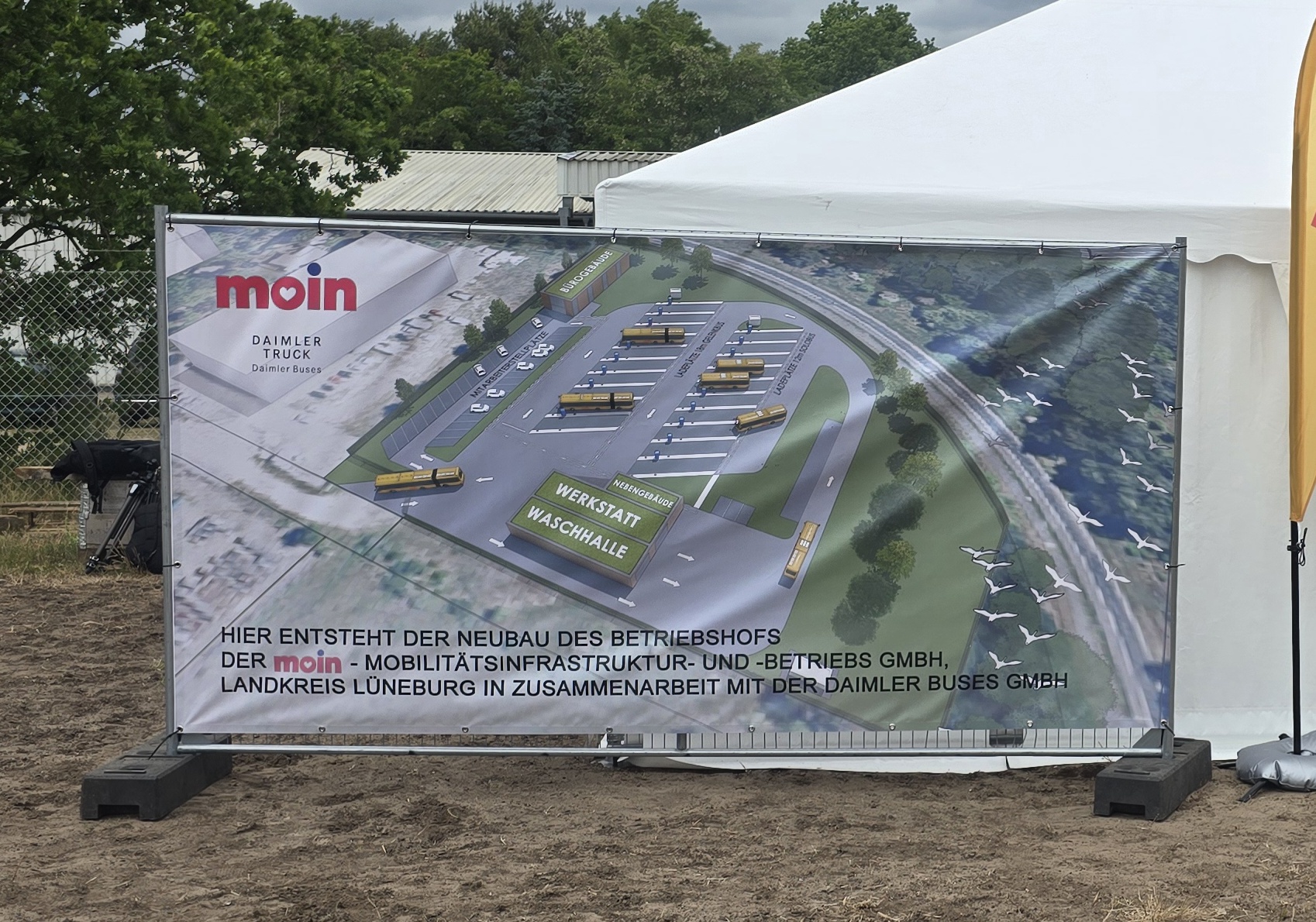„Mit diesem Betriebshof legen wir den Grundstein für einen neuen Nahverkehr – klimafreundlich, zuverlässig und kommunal organisiert“, betont Nikolas Wenzel, Geschäftsführer der MOIN. „Wir freuen uns, mit Daimler Buses einen Partner an unserer Seite zu haben, der dieses Vorhaben aus einer Hand und in kürzester Zeit realisiert. Wir sind zuversichtlich, den ambitionierten Zeitplan gemeinsam erfolgreich umzusetzen. Dazu gehört auch, dass wir kurzfristig einen entsprechenden Bauantrag für den Betriebshof stellen werden.“ Für Lüneburgs Landrat Jens Böther hat das Projekt Strahlkraft über die Region hinaus: „Auf dieses Projekt schaut nicht nur die Region, nicht nur der Landkreis Lüneburg, sondern auf dieses Projekt blicken Kommunen in ganz Deutschland. Wir setzen damit ein echtes Ausrufezeichen: Mit einem technisch innovativen Betriebshof unterstreichen wir unser Engagement für den Klimaschutz.“ Am Spatenstich nahm auch Lüneburgs Oberbürgermeisterin Claudia Kalisch teil: „Eine moderne Verkehrspolitik kann nur mit Stadt und Kreis gemeinsam gelingen. Mit dem Betriebshof der MOIN gehen wir einen wichtigen Schritt in Richtung Mobilitätswende. Als Hansestadt freuen wir uns auf ein gutes Nahverkehrsangebot – mit E-Bussen und damit weniger Lärm und besserer Luft in der Innenstadt.“ Für Daimler Buses war unter anderem Projektleiter Elias Mex beim Spatenstich dabei.