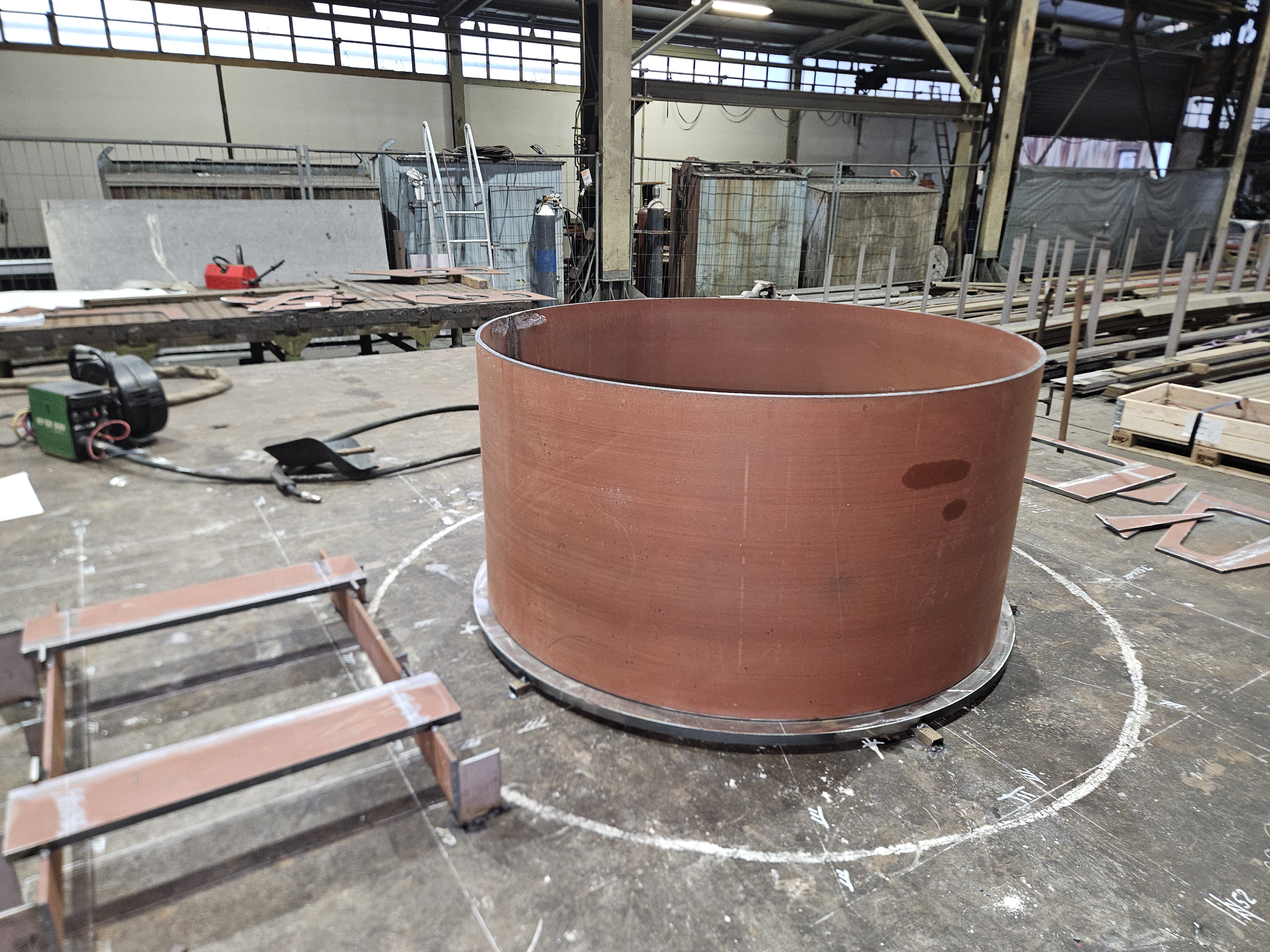 Beginn der Schweißarbeiten an den ersten Stahlteilen.